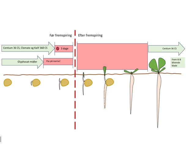 • Tag evt. glyphosat med før fremspring ved meget højt ukrudtstryk i marken.