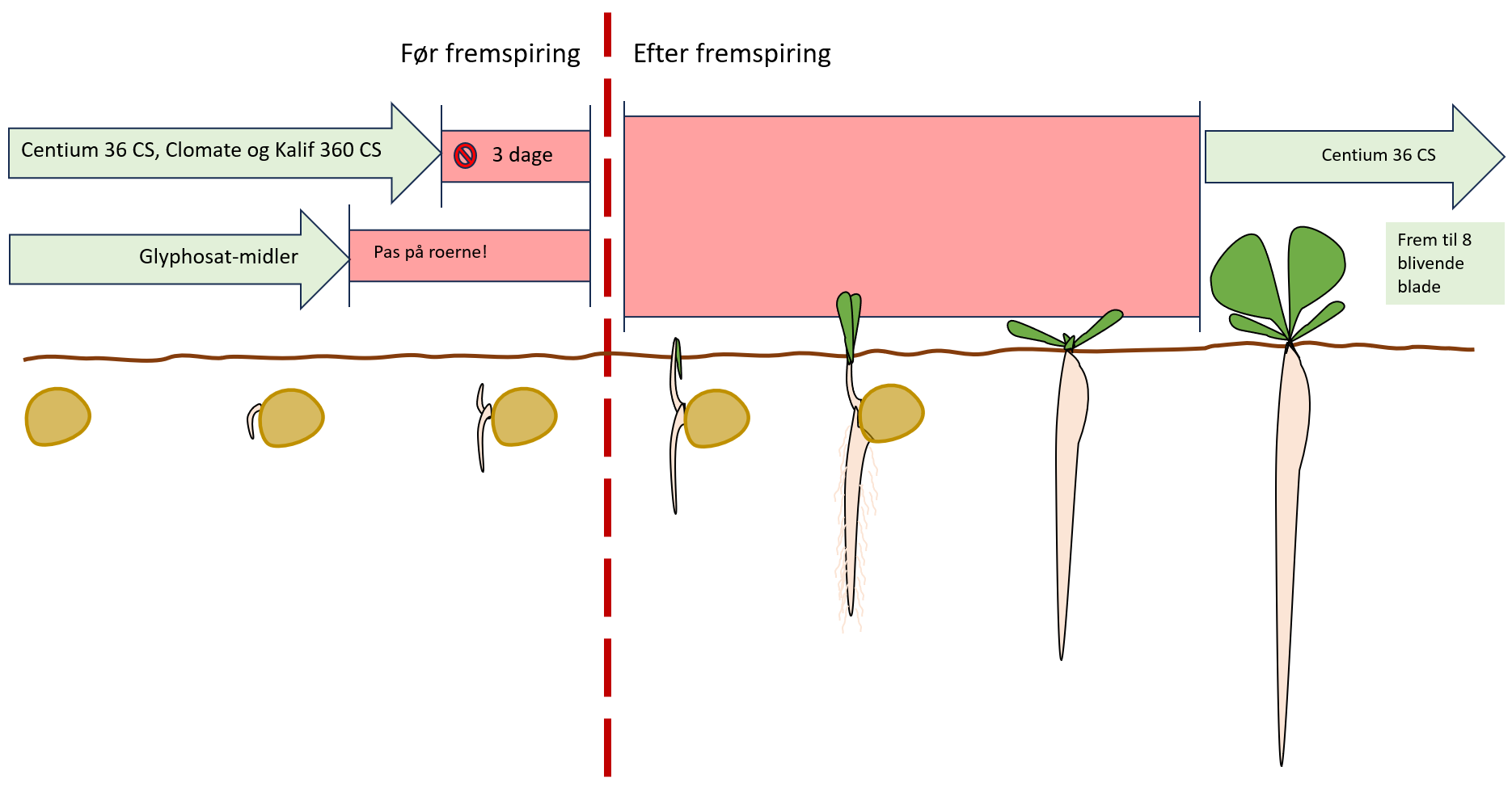 • Før fremspiring kør med 0,05 - 0,1 l/ha afhængig af jordtype.