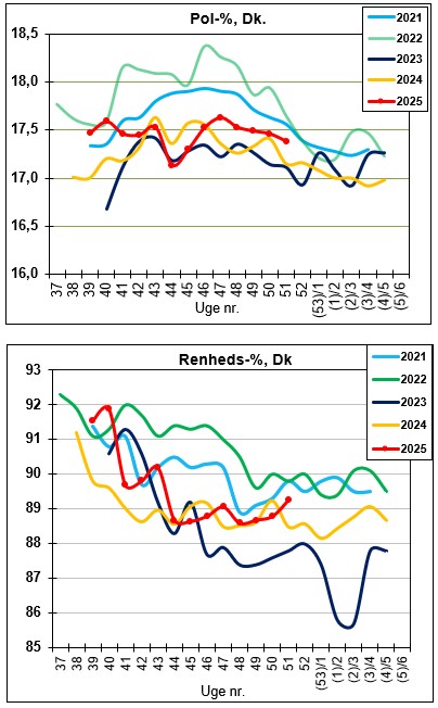 I nedenstående kurver vises pol-% og renheds-% for de sidste fem år.