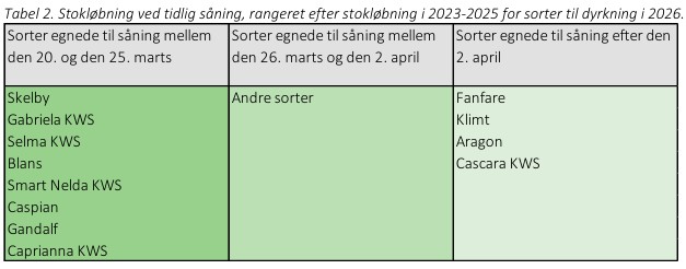 Hvilke af årets sorter, der er bedst egnet til tidlig såning, kan dels ses i sortslisten med frøfirmaernes kommentarer ved klik her, eller i nedenstående tabel fra NBR's faglige beretning 2025 fra side 14: